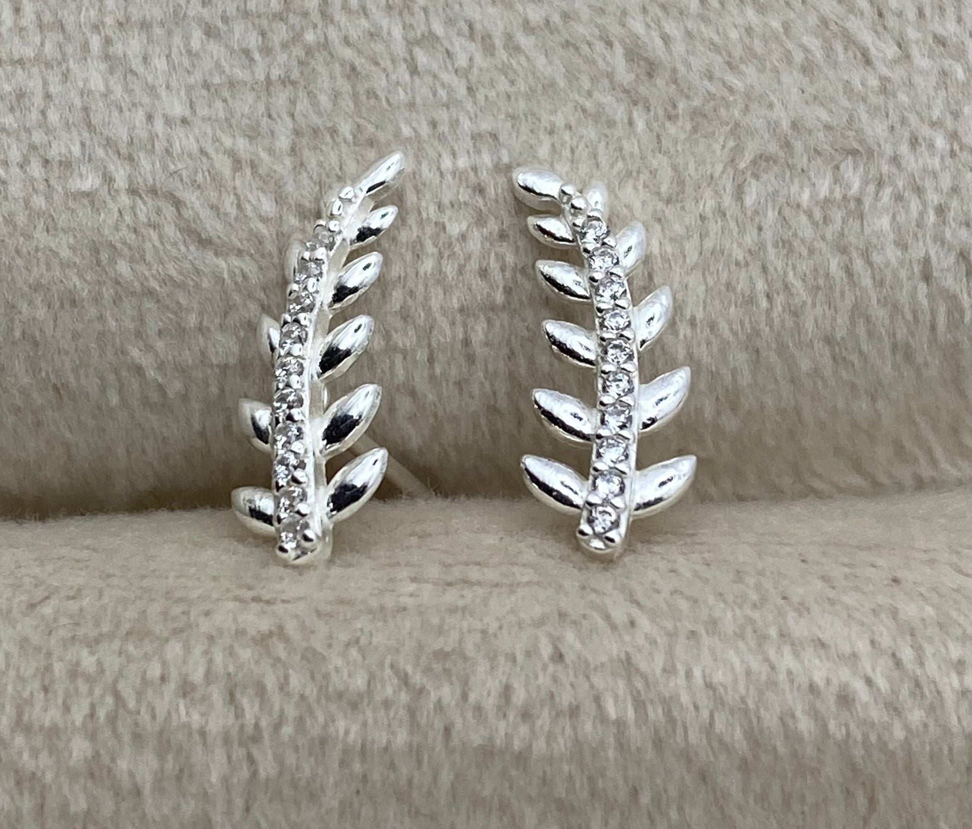 Sterling Silver Leaf Stud Earrings with Tiny Cubic Zirconia Crystals